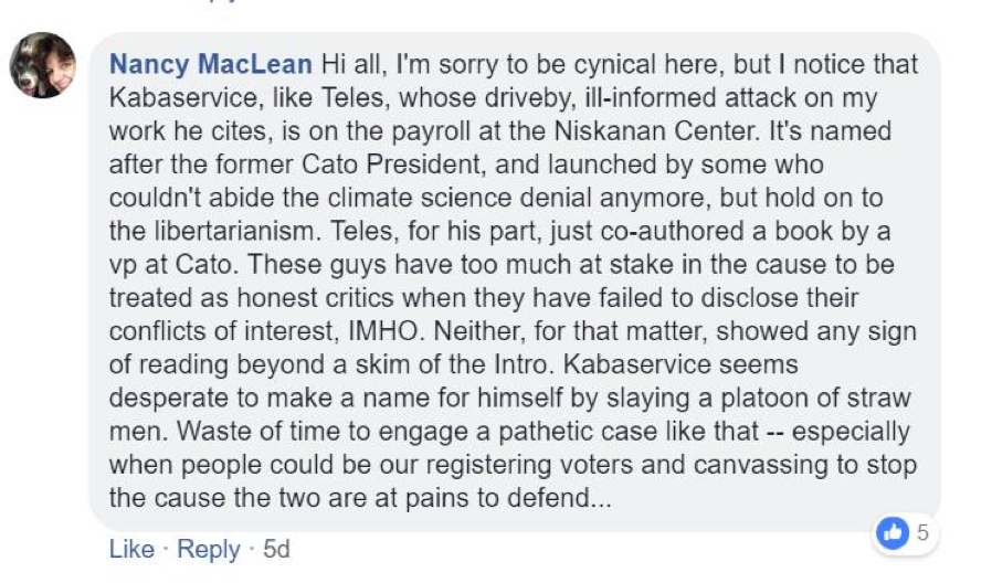 Why does Professor MacLean make such basic errors and misstatements of motivation? The answer, I fear, is that she cannot imagine any criticism of her work that is not motivated by partisanship and financial conflict of interest. But the truth is that there are now significant scholars who are not on the right who read her book and had much the same reaction that Henry and I had. Those range from the sociologist Elizabeth Popp Berman at Albany (who describes the book as “hyperbolic, overly speculative, and sometimes uses sources in misleading ways”) to the Stanford University historian Jennifer Burns (“Democracy in Chains is characterized by a fundamental lack of curiosity. The book is disconnected from not just economics or political theory, but from all the social sciences…it bears witness to an alarming parochialism.”) And that’s just as a taste.