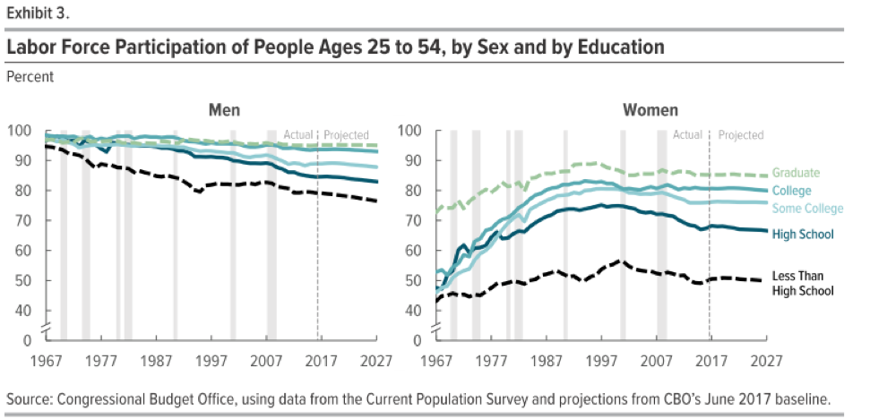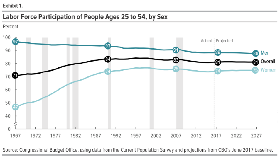 Let’s look at some of the key findings of the CBO report. First, we find that labor force participation as a whole has declined since its peak in the early 1990s. As the following chart shows, LFP rates are expected to stabilize for men and increase slightly for women over the next decade, but not to return to their former peak values. (Gray bars denote recessions.)