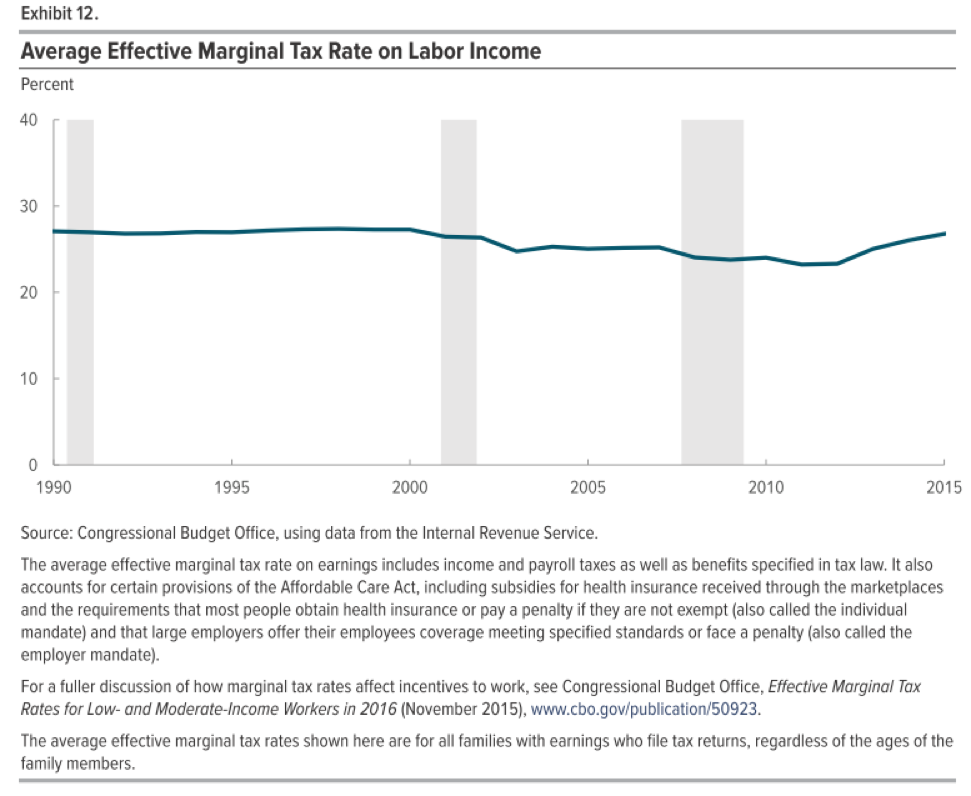 Finally, as the next chart shows, we learn that effective marginal tax rates (EMTRs), which strongly influence work behavior, have risen in recent years. A household’s EMTR includes both its explicit rates of income and payroll taxes and the implicit tax rates that arise from reductions in social benefits—income support, healthcare, food, housing, and other programs.