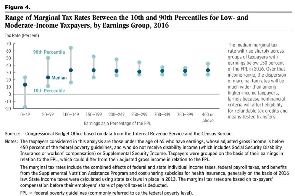 A chart from a different CBO report shows that EMTRs are especially high and variable for households near and just above the federal poverty line. Those households include a high proportion of the less-educated persons whose LFP is especially low. Note that the chart does not include people covered by SSDI. Implicit marginal tax rates are even higher for people on SSDI, since more than a minimal amount of work can lead to the loss, not only of cash benefits, but also of Medicaid coverage.
