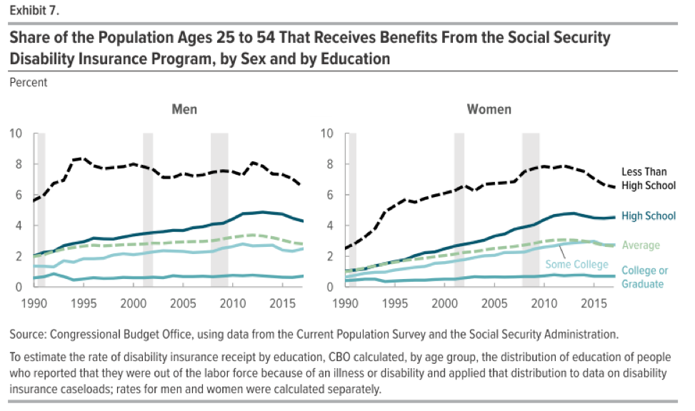 Third, the next chart from the CBO report shows that disability contributed significantly to the decline in LFP, especially for those with less education. Lower LFP due to disability is a result, in part, of an actual decrease in the average health of the working-age population, but that is not the whole story. Participation also falls because lower-income workers turn to Social Security Disability Insurance (SSDI) as a substitute form of long-term unemployment insurance. But once they are enrolled in SSDI, their incentives to rejoin the labor force are greatly reduced. As a result, the disability rate falls only slowly during economic recoveries—an example of hysteresis in labor markets.