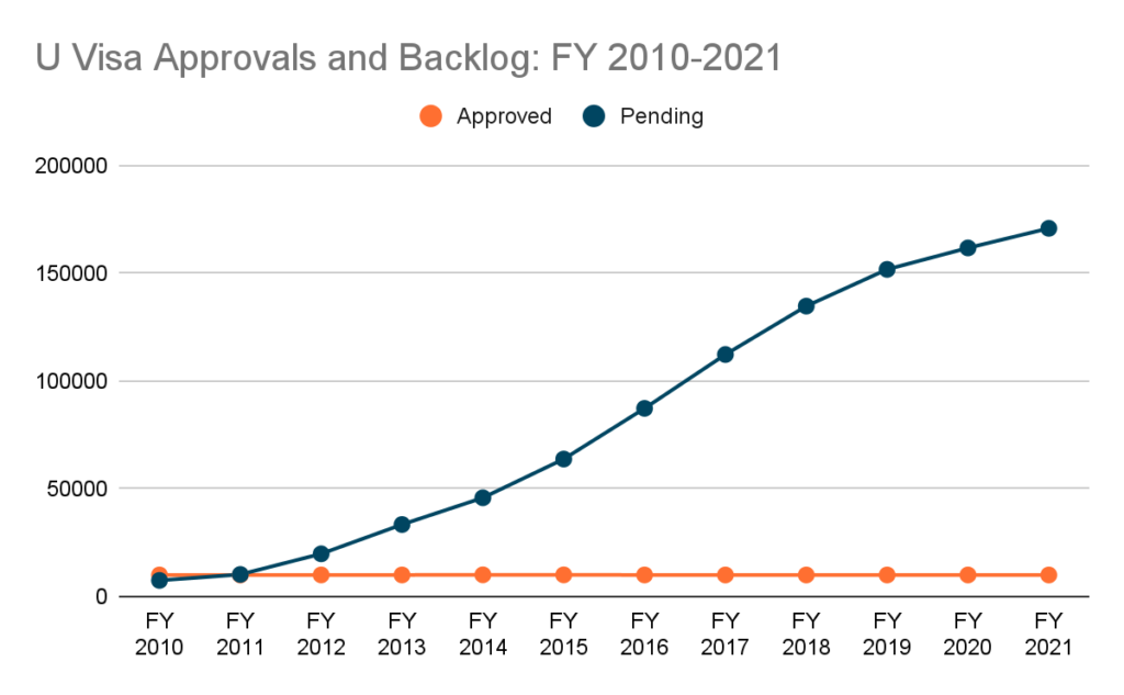 Another problem with the current U visa program is the enormous visa backlog. The TVPA only authorizes 10,000 visas annually. This cap has been reached every year since fiscal year 2011, and the visa backlog as of the end of FY 2021 stands over 170,000, growing on average by over 16,000 applications annually between FY 2011 and FY 2021. Using these numbers, if no new U visa petitions were filed, it would take over 17 years to completely clear the backlog.