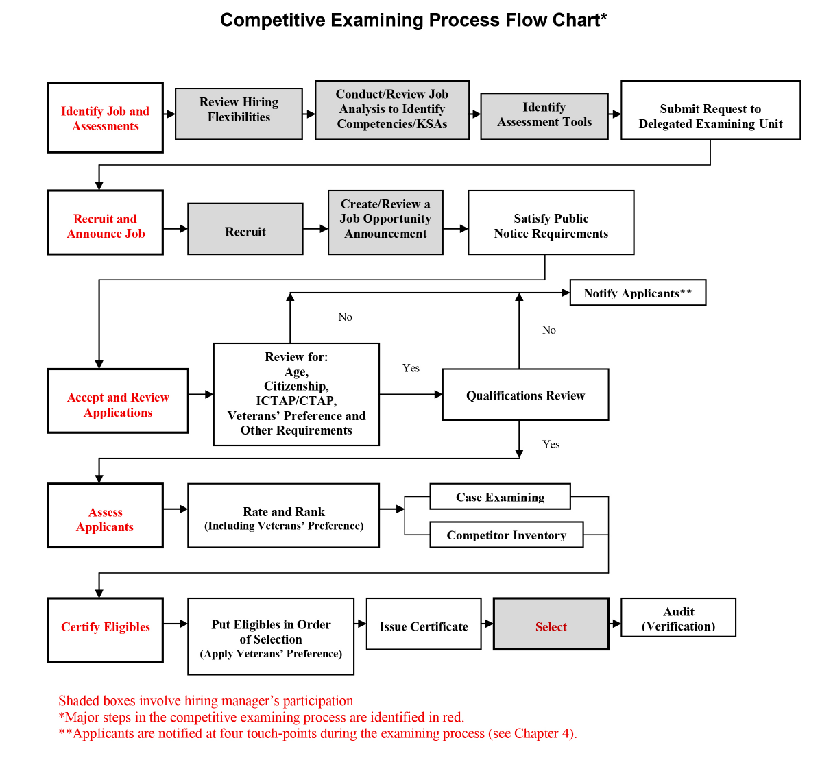 OPM’s Delegated Examining Operations Handbook33 includes process flows that outline limited roles for the hiring manager (see diagram below). Out of 22 steps, hiring managers are involved with only six, and their discretion is sharply limited in most of them, including selecting from a certificate of qualified applicants selected by a process they’ve been largely divorced from. Neither federal statute nor regulation requires this; it has been introduced by OPM and appears to be changeable without Congressional or regulatory action. However, it’s not enough to simply change the guidance – OPM has to work with the entire HR profession to shift the culture of hiring to prioritize involvement by and satisfaction from hiring managers with the process.