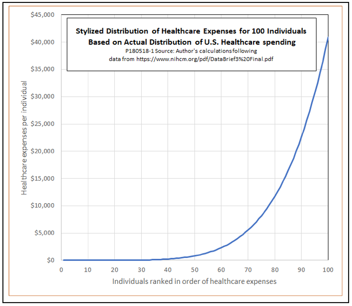 However, copays also have their drawbacks. One is that for a given out-of-pocket maximum, a UCC plan with copays would be more expensive for the government to operate. To see why, suppose that our Plans A and B were applied to 100 individuals, whose health care spending was distributed according to the pattern shown in the following chart. As in the actual distribution of health care expenses for the U.S. population, this stylized distribution of spending is highly skewed. The average is $10,000 per person, but a third of the population spend less than $100 each, while the top 20 percent of individuals account for more than 80 percent of the total.