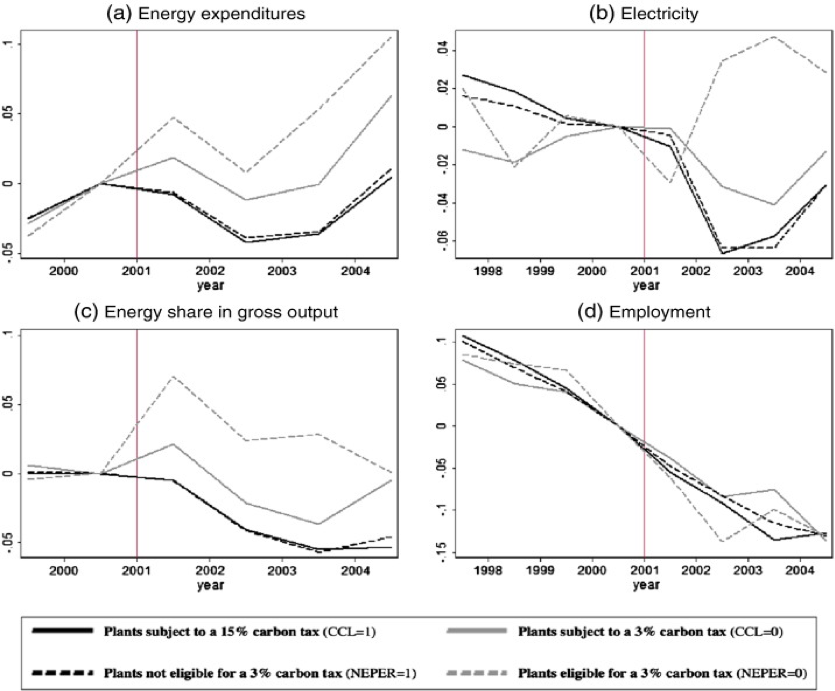 “robust evidence that the CCL had a strong negative impact on energy intensity and electricity use.” In contrast, they “do not find any statistically significant impacts of the tax on employment, revenue (gross output), total factor productivity or plant exit”