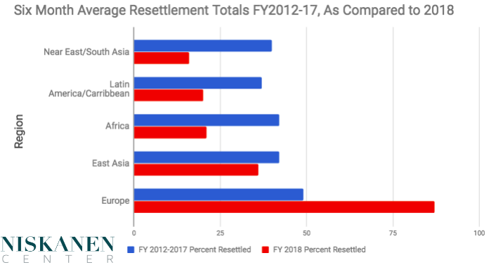 After six months, not only are the total numbers for refugees resettled in the country low, but they are unbalanced. Almost four times as many Europeans have been resettled than those from around the world, as a proportion of their respective caps; the Near East/South Asia, Africa, and Latin America/Caribbean regions are dramatically lagging in total percent resettled.