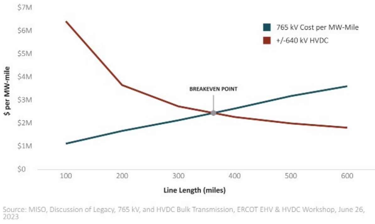 When it comes to moving large quantities of power reliably over long distances, a macrogrid with interregional HVDC lines as its foundation is a more effective solution than the existing AC grid alone. HVDC lines have large upfront costs due to the need for expensive converter stations, but have lower capital costs per mile. The per-mile savings begin to pay for the upfront cost at a line length above 350 miles, according to a study from the Midwest Independent System Operator, summarized in Figure 3.