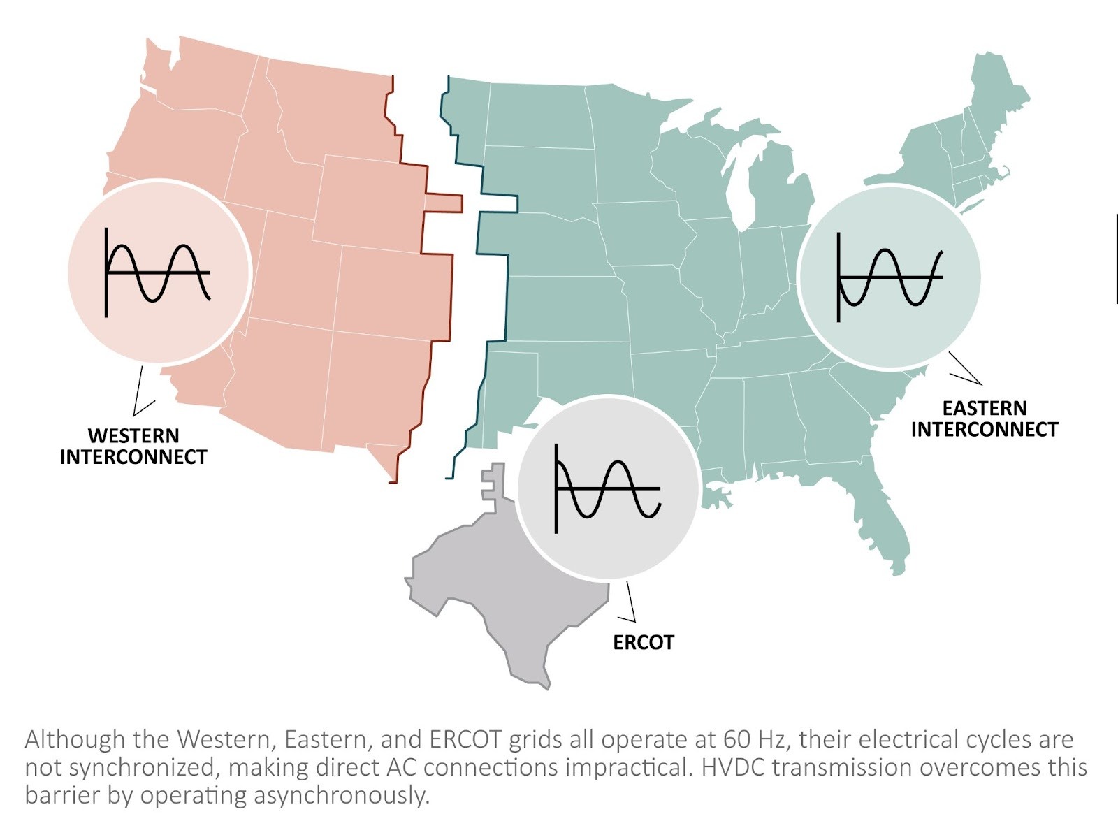 Achieving greater interconnection without sacrificing state control hinges on a technical distinction that is often overlooked. The Western, Eastern, and ERCOT grids each run on a timing of 60 cycles per second, meaning that the electricity oscillates 60 times per second as it flows. However, each interconnect’s cycle is slightly out of sync with the other two, so they are never at the exact same point at the exact same time. Such fractional differences make linking any two of the grids with traditional alternating current (AC) transmission an extremely difficult engineering task.