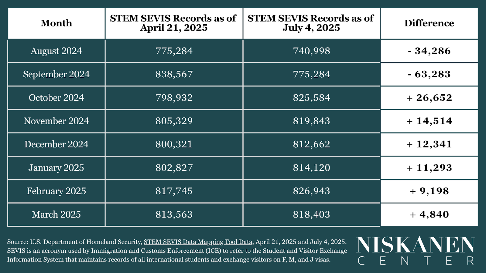 As of April 21, 2025, DHS data indicated that there were 838,567 active SEVIS records enrolled in STEM in September 2024. By the time the data was republished in July 2025, the data suggested that only 775,284 SEVIS records were enrolled in STEM in September 2024. Again, DHS made these changes without announcement or explanation.