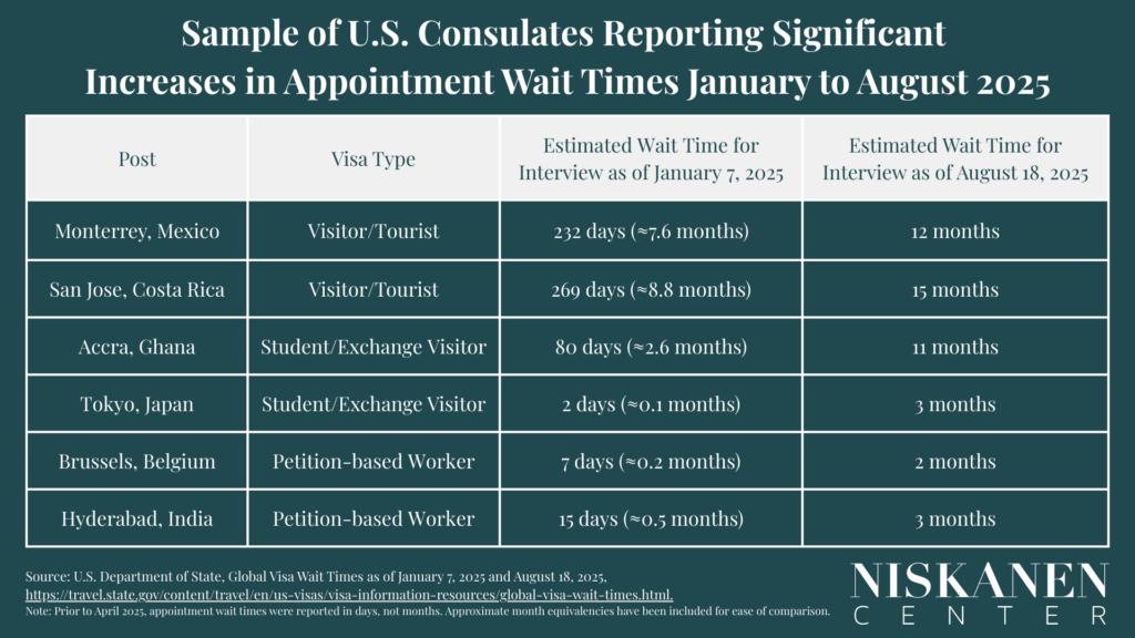 - On average, among reported posts, the estimated wait time for a visitor, or tourist visa appointments increased by 69 percent between January 7, 2025 and August 18, 2025.