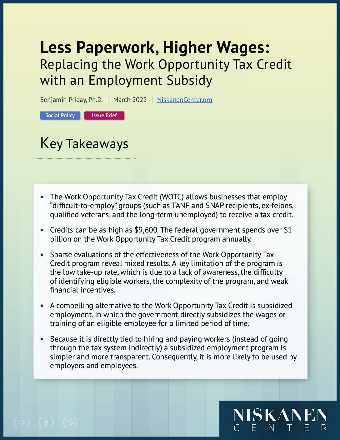 At the same time, there are a number of state and federal programs aimed at stimulating demand for labor. One such program is the Work Opportunity Tax Credit (WOTC), which allows businesses to apply credits against their taxable income. Unfortunately, take-up of the WOTC is very low. Many firms and individuals that would benefit from using it fail to do so. This is partly due to a lack of knowledge of the program, but it is also due to the administrative burdens involved in accessing the program: Employers must identify workers who are eligible for the WOTC and navigate a complex web of IRS forms to receive the credit. Moreover, a tax credit applied at the company level may not be worthwhile for a specific hiring manager to pursue. An alternative to the WOTC would be direct subsidies to companies that hire individuals from targeted groups. For example, the government could cover all or a portion of wages for a limited time period. A direct subsidy continues to work as a demand-side incentive to hire targeted workers but has the potential to be simpler and more transparent, resulting in a more effective program.