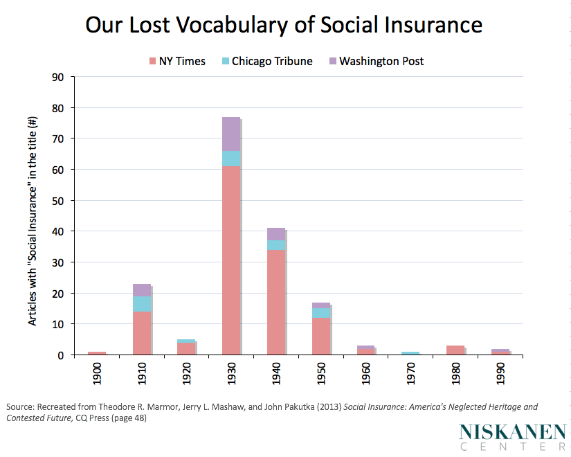 In the mid-1930s, when the retirement and survivors insurance programs had their legislative start, university-educated Americans had every reason to be clear about what distinguished social insurance from its commercial counterpart. Indeed, most undergraduate programs in the social sciences took up social insurance’s rationale and history. But note the data measuring the historical use of the expression in three of America’s most important daily newspapers. The changes recorded are startling. By the end of the 20th century, the category of social insurance had seemingly lost its place in the vocabulary of American politics.