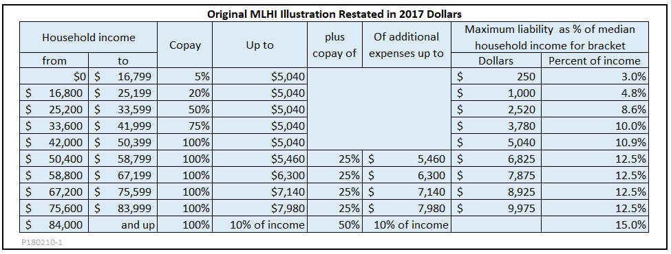 As applied to healthcare, these principles called for a compromise between a single-payer system that would provide complete healthcare coverage to everyone and one that would leave people entirely to fend for themselves in the marketplace. As the proposal put it, “The public’s health concerns are dominated by the fear that they will be overwhelmed by costs catastrophic relative to their income,” with the result that “segments of the population are not receiving the care they should solely because of costs.” The proposed solution, called Maximum Liability Health Insurance (MLHI), was crafted to be relatively simple, to address the problem effectively, and to represent a “legitimate but not an overwhelming” role for the federal government.