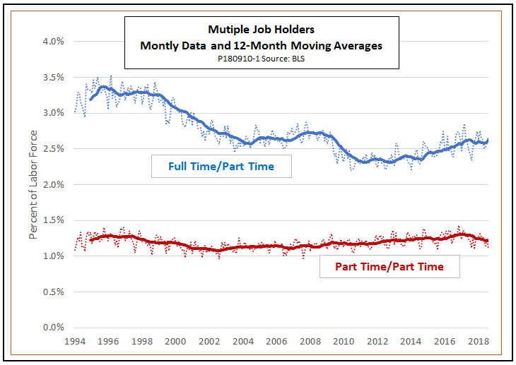 In a robust economic recovery, the number of full-time workers should be rising, and the number of workers employed part-time or holding multiple jobs, should decline. The rise in the number of multiple job holders is troubling, and is yet another signal that there is still slack in the labor market.