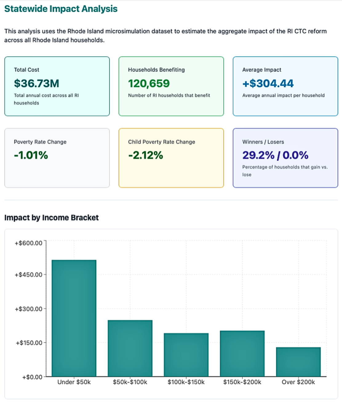 We worked with PolicyEngine to design a child tax credit calculator for Rhode Island. The calculator allows users to simulate the cost and impact of reducing or eliminating personal exemptions for dependents and replacing them with fully refundable child tax credits. Users can change the parameters (e.g., credit amount, age eligibility, and earnings requirements) to explore the impact of potential reforms.
