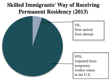 It is wrong to draw a sharp distinction between H-1Bs and foreign-born permanent residents who can start businesses. In 2013, like prior years, 95 percent of all high-skilled immigrants—employment-based immigrant workers with at least a bachelor’s degree—adjusted their status from “temporary” to “permanent” in the United States.[11] The H-1B visa has long been a gateway into the United States for immigrant entrepreneurs who create businesses that employ Americans.