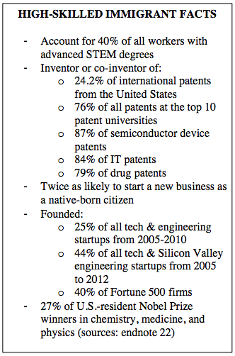 For sources for “Facts about High Skilled Immigrants,” see note 23 and note 16.