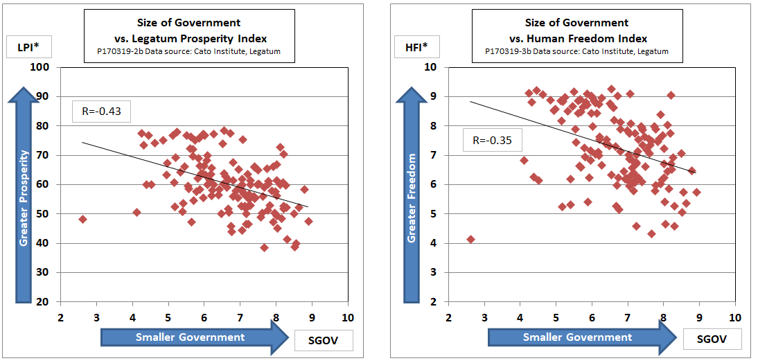 The results are not consistent with the hypothesis that small government is associated with greater prosperity or greater human freedom. Here are the scatter plots using SGOV for a sample of 143 countries. (Plots for SoG are similar, although the fit is not as tight.)