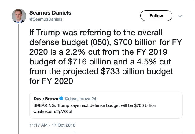 How significant a “cut” a $700 billion defense budget represents depends on the baseline. As Seamus Daniels, a defense budget researcher at the Center for Strategic and International Studies, noted on Twitter when the $700 billion figure was first raised, it would represent 2.2 percent less than the FY2019 budget.