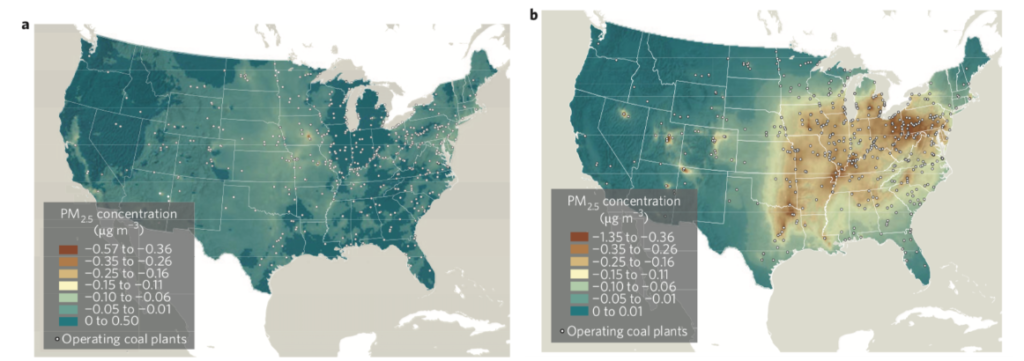 The study used a combined model of the energy system and air quality to evaluate how climate policies would influence air quality. The following figure shows the relative improvements in ambient concentrations of PM2.5 for a modest improvement in efficiency rates at coal plants (the policy being contemplated by the EPA as a replacement for the Clean Power Plan) and a more stringent intervention akin to the Clean Power Plan or a meaningful carbon tax.