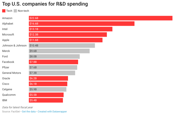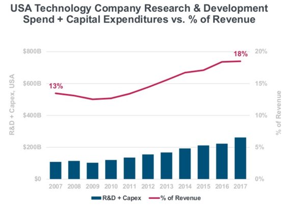 The second-to-last chapter of Wu’s book is titled “The Rise of the Tech Trusts,” and the extra attention these companies receive is understandable given their prominence in the economy. But before we break up Big Tech, there are other important facts about the tech industry to consider. The top five companies that spent the most on research and development last year were all tech companies. Combined spending on R&D and capital expenditures at technology companies is increasing as a percent of revenue over time. The Big Five — Apple, Amazon, Facebook, Google, and Microsoft — may be dominant, but they also compete against each other in a wide range of product categories. Big tech companies simply are not acting like the complacent monopolies Wu portrays.