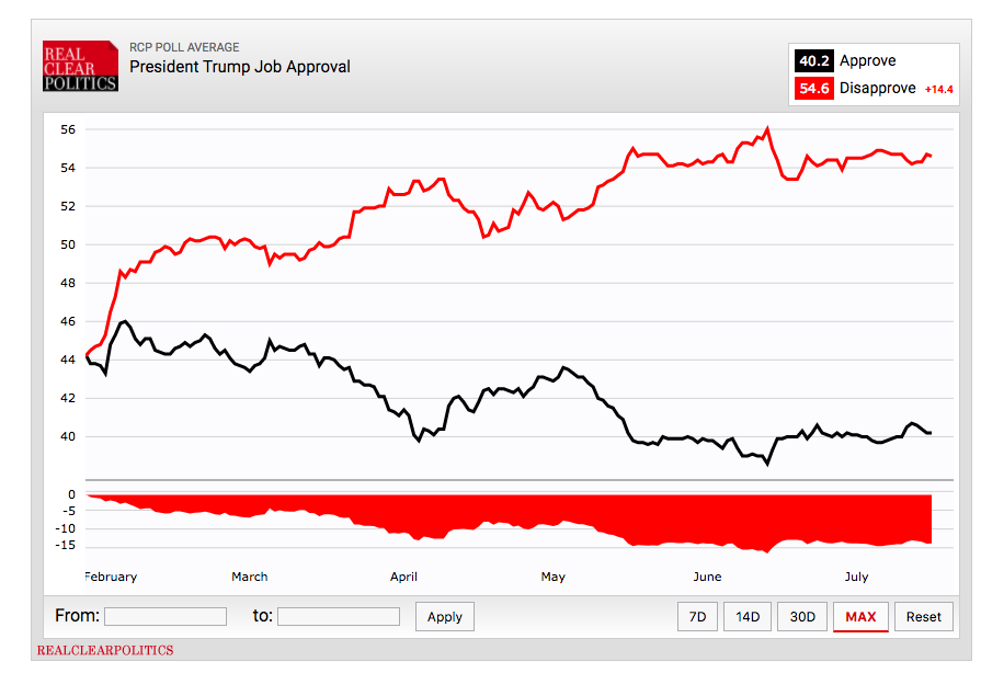 Arguably the most prominent factor in this determination is that the President’s approval ratings are deeply underwater. According to Real Clear Politics, the President’s disapproval rating is 14 percentage points higher than his approval rating.