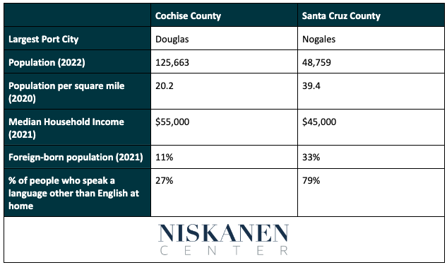 In 2022, Census data reported that Cochise County had an estimated population of 125,663 people, which equates to about 20.2 people per square mile, and Santa Cruz County had a population of 48,759 people at 39.4 people per square mile. The median household income in 2021 was $55,000 in Cochise County, compared to $45,000 in Santa Cruz County.
