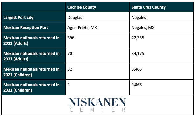 Despite similar population sizes, Nogales is a much busier port: in 2022, all traffic through the Nogales port was nearly triple that of Douglas. According to data from the Mexican government, Nogales also returns a much higher number of apprehended Mexican nationals to Nogales, Mexico than Douglas does to Agua Prieta, Mexico.
