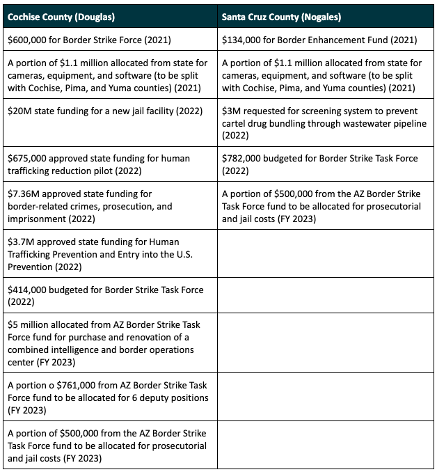 A Joint Legislative Budget Committee report showed that for FY2023, Cochise County had $5 million to purchase and renovate the Southeast Arizona Combined intelligence and Border Operations center. An apportion of $761,700 will also support six deputy positions in the Sheriff’s office. The only funding reported as being allocated to Santa Cruz County is a portion of $500,000 for prosecutorial and jail costs, to be split with Cochise County and Pima County.