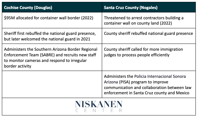 An examination of two neighboring counties covering 138 miles of the Arizona border with Mexico reveals differences in opinion and policy toward the situation at the U.S. southern border. Cochise County has liberally pursued and spent state funding, while Santa Cruz County has engaged minimally with state resources. A shipping container border wall was accepted ten miles from the Cochise County border, whereas next door, the Sheriff of Santa Cruz County threatened to arrest any contractors placing containers in his county.