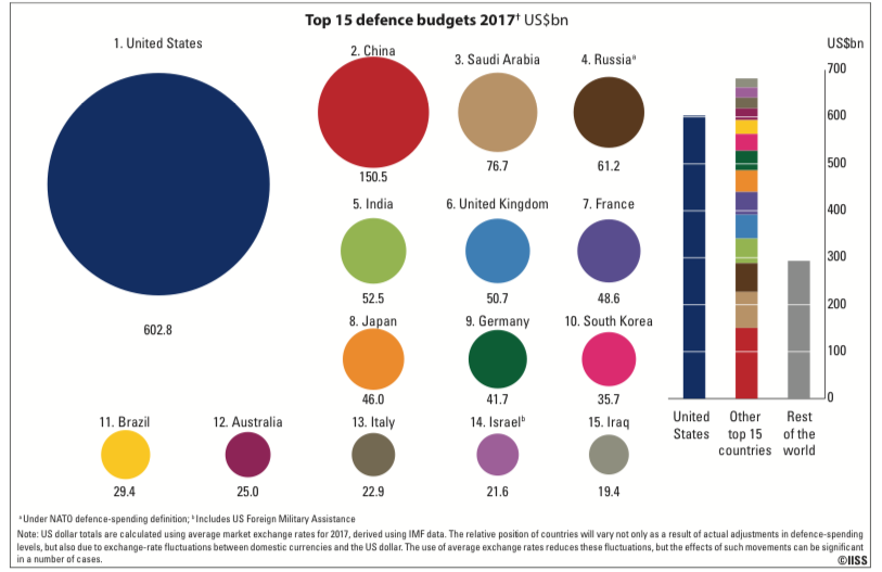 This week also marked the release of the 2018 Military Balance, a publication of the International Institute for Strategic Studies that provides estimates on international military spending. As the chart below demonstrates, the Military Balance provides useful context for understanding American military spending in comparison to the major power rivals with which the National Defense Strategy is ostensibly most concerned.