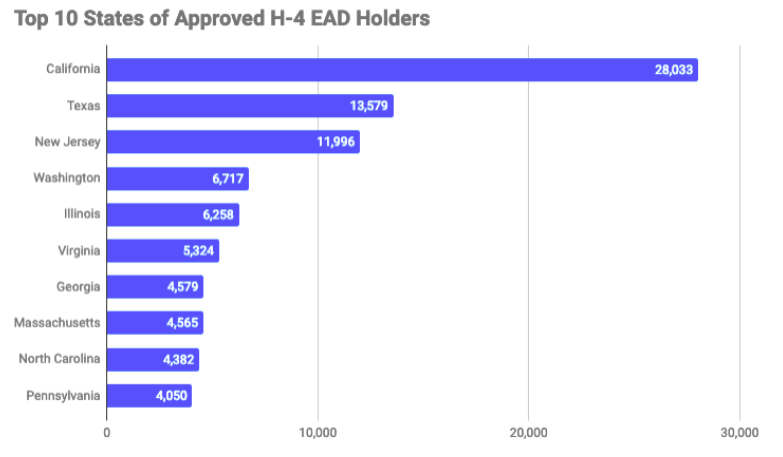 The Trump administration is in the process of terminating the H-4 employment rule. In total, about 100,000 H-4 spouses could lose their work authorization. The latest data from the Congressional Research Service outlines where H-4 holders are, and the top 10 states are reflected in the chart below.