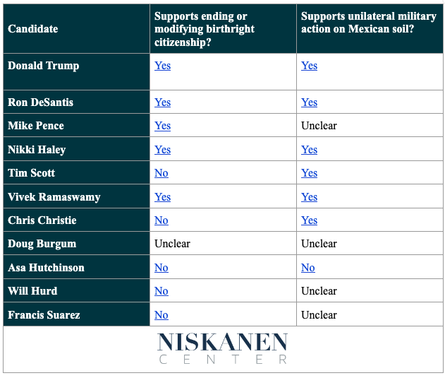 What’s notable about the 2024 GOP primary is the degree to which the immigration platforms of the leading candidates converge. To date, none of their campaign websites mention support for legal immigration pathways. Challenging birthright citizenship and taking unilateral military action within Mexico to combat cartels and force more migration controls — once hardline positions within the party — now have almost unanimous support among the leading candidates.