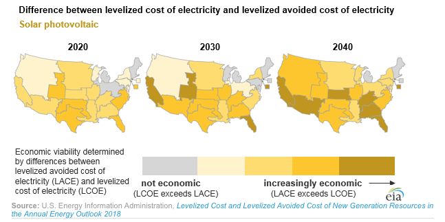What is interesting to me, and what I offer as a question, is why does the future of natural gas looks so good to the EIA? In a blog post, the EIA explains how it measures the cost-competitiveness of different energy resources over the next few decades. The metrics work when you compare the levelized cost of electricity (LCOE) to the levelized avoided cost of electricity (LACE), where the former is the cost of adding new capacity to the grid and the latter is the value of adding new capacity to the grid. So, when LACE is higher than LOCE for a particular source, it is worth it to build capacity of it.
