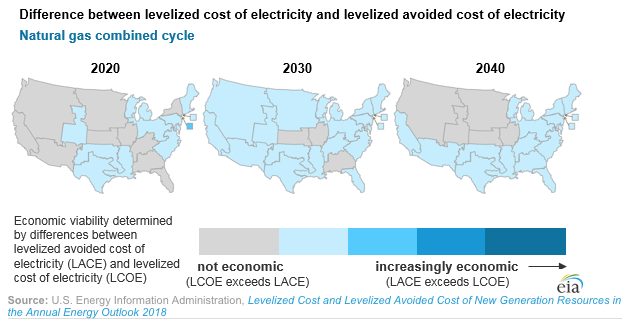 This chart shows the EIA’s comparison of the two for solar energy being built in the next few decades. I read it showing new solar installs getting increasingly competitive (especially in the South). A bright future, it seems. The next chart shows the same metrics for combined cycle natural gas, which hardly looks so bright, as combined cycle natural gas is increasingly uncompetitive (especially in the upper midwest?).