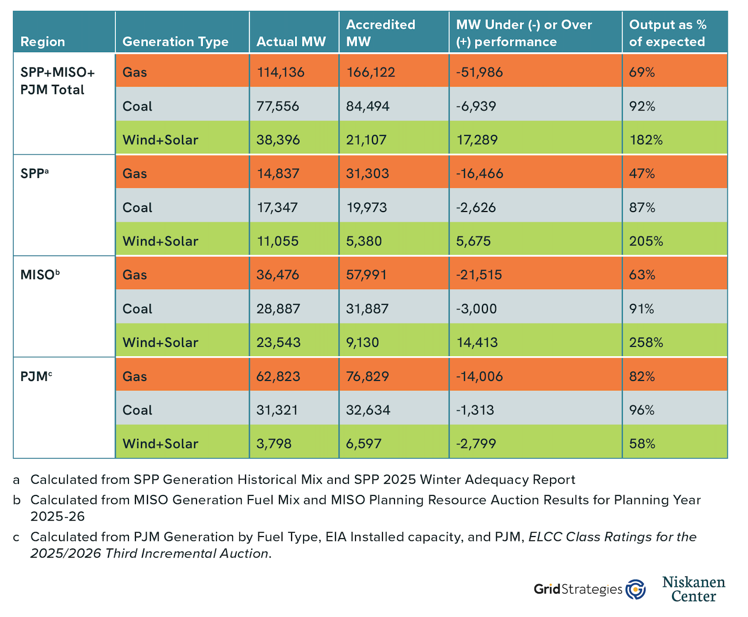 The three hardest-hit grid regions — Southwest Power Pool (SPP), PJM Interconnection (PJM), and the Midcontinent Independent System Operator (MISO) — exhibited similar results in the performance of conventional vs. renewable power. Table 1 below compares the actual output of each fuel type against its accredited capacity. Accredited capacity is how much power a grid operator expects from a generating resource during periods of peak need, compared with the maximum amount of power that a given resource could provide. In regions with a capacity market, this accreditation is also used to determine how and for what a resource gets paid.