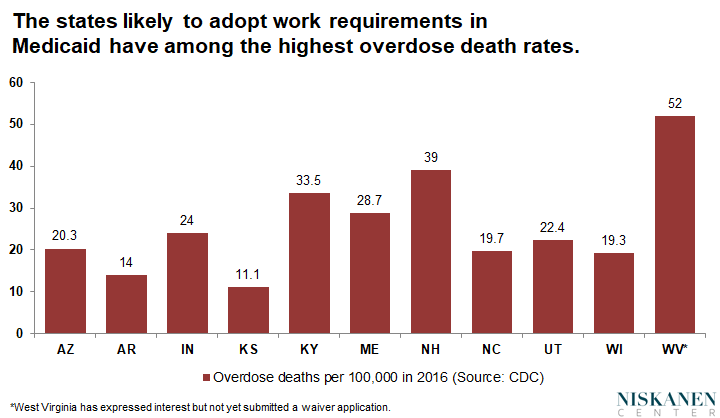 It’s worrying, then, that of the 10 states that have requested waivers for work requirements in Medicaid, eight have overdose death rates roughly equal to or significantly above the 2016 national average (19.8 per 100,000), including outlier states like New Hampshire, Maine and Kentucky. As of November 2017, West Virginia is also considering adding work requirements to the Medicaid program. West Virginia has the nation’s highest opioid-death rate at 52 per 100,000 people in 2016. Not only are these some of the last places in the country that should be experimenting with work requirements in Medicaid — if anything, they should be combining lower barriers to Medicaid access with an aggressive opioid abuse outreach program.